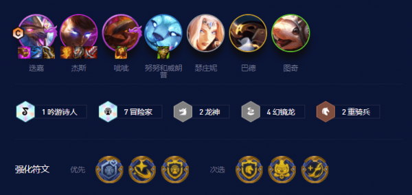 这套阵容的核心是迭嘉单核,其他人吃冒险家的属性,去补充伤害,打控制,而迭嘉作为主打AOE伤害的单位,在面对对面单核体系时会非常吃力。但是迭嘉作为龙神,存活能力还是很强的,站位压力很小。克制:玉龙体系,炮手体系,碧波体系。被克制:神龙体系,乌鸦体系,风暴龙体系。