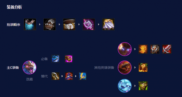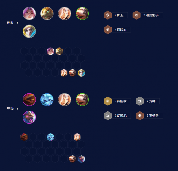 二阶段时:最优情况是2护卫+2射手(EZ+老鼠),五级再补上猪妹或者其他二星卡。有装备就做,体系里面只有主C的装备是至关重要的,其他的卡装备是无所谓的。一些通用装备,泰坦日炎斗士可以直接用的,过渡阵容甚至可以选择三玉龙这样的强力羁绊,给到猴子贾科斯,后期再给呲呲和杰斯。正常上人口2-1上四级,2-3或者2-5上五级,3-1上六级,尽可能去连胜,不能连胜的话保经济最重要,经济比血量重要,这套阵容想要吃鸡需要大量的经济。三阶段时:就要根据自己现在的质量去决定要不要快速拉六级拉七级去进行压制保连胜,但是核心思路仍然是以经济最重要。