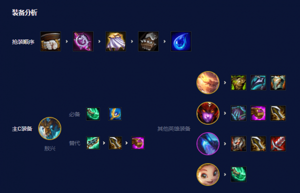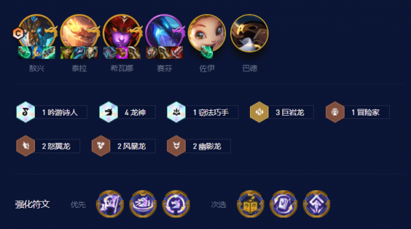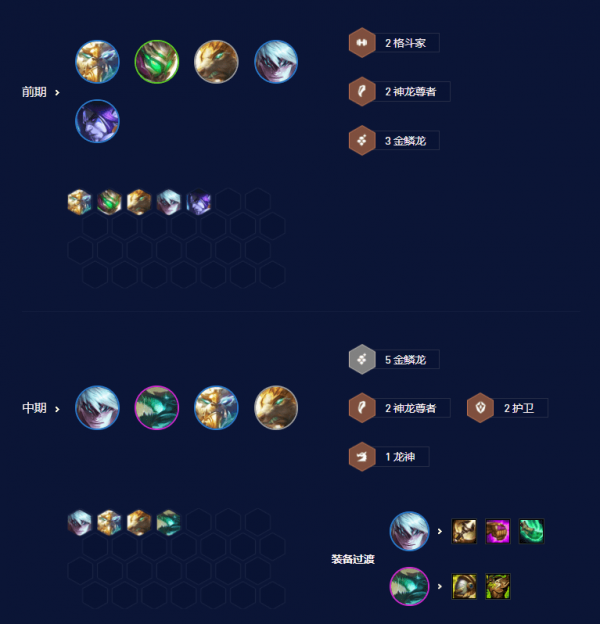 前期优先拿巨人腰带做肉装。阵容成型需要大量的经济支撑,所以前期最好能用金鳞龙过度先攒钱,没有3金鳞龙也可以选择海盗的环境碧波龙或者强势连胜保证血量经济。3-2来龙神时代或者龙神之魂,就是天胡开局,不管是什么高费龙神都有足够的战斗力到8级.