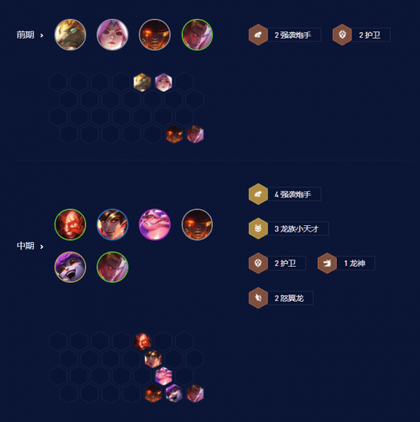 稳健运营:前期尽量用强势棋子与羁绊打工,保证打工棋子2星,进而稳定血量健康,步入7与8阶段,7与8阶段低费打工卡向以4-5费棋子为核心阵容转型
