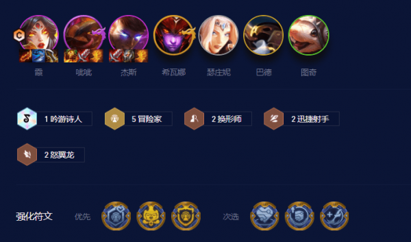 冒险家转职一定是最好的海克斯,拿到转职可以把转职给到霞,并且开出8冒险家的顶级羁绊,而阵容核心就是每一张卡都有战斗力,所以星界赐福是大于狩猎律动的,然后就是源计划甲壳,源计划植入,这一类直接增加战斗力的海克斯也是非常不错的选择