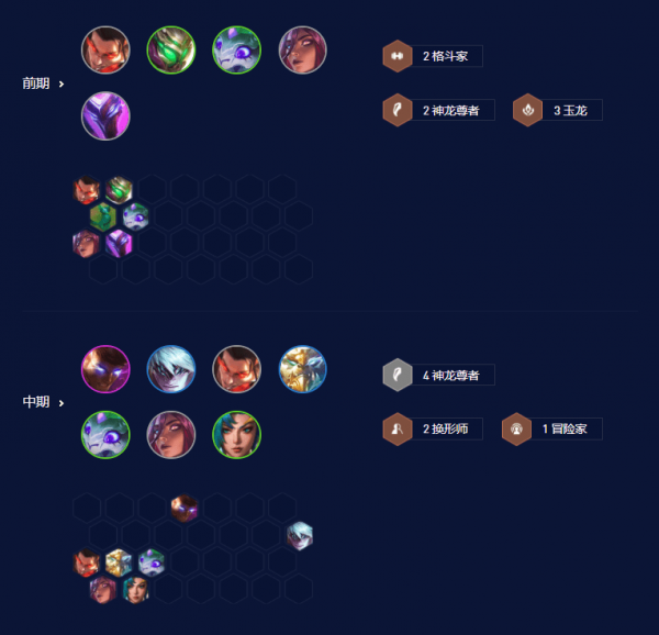 二阶段时:最优情况是三玉龙卡尔玛+贾克斯,纳尔,腕豪,蝎子,三玉龙尽可能的去配上二星的战士英雄,战士英雄加上玉龙的属性,前期战斗力非常客观。正常上人口2-1上四级,2-5上五级,3-1上六级。三阶段时:就要根据自己现在的质量去决定要不要快速拉六级拉七级去进行压制保连胜,最核心的思路是养经济,因为这套阵容是一套强锁血的阵容,只需要二星杰斯就能强力锁血。