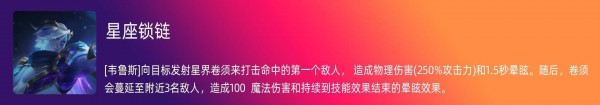 [韦鲁斯]向目标发射星界卷须来打击命中的第一个敌人, 造成物理伤害(250%攻击力)和1.5秒晕眩。随后,卷须会蔓延至附近3名敌人,造成100 魔法伤害和持续到技能效果结束的晕眩效果
