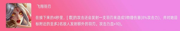 在接下来的4秒里,[ 霞]的攻击还会发射一支羽刃来造成5物理伤害(8%攻击力),并对她目标附近的至多2名敌人发射额外的羽刃。羽刃们会落在她目标们的身后。在这个持续时间结束后,[ 霞]会召回她的羽刃。每支羽刃会对命中的敌人们造成28物理伤害(30%攻击力血+10)