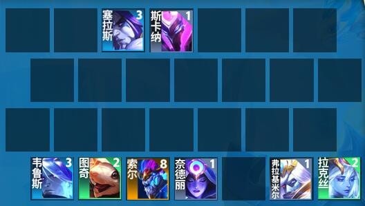 1、阵容配队:奈德丽+弗拉基米尔+斯卡纳+拉克丝+图奇+韦鲁斯+塞拉斯+索尔