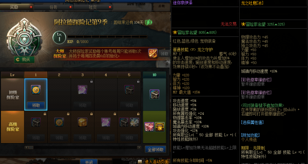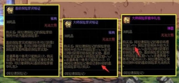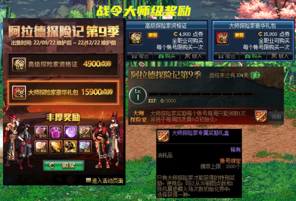 本次第9季阿拉德探险记,跟以往的不一样,多了“大师级”探险家奖励。当玩家购买159档大师探险家豪华礼包时,每个账号每周,可以领取一个专属奖励礼盒,使用后,能从30刷图点和1张风暴逆鳞入场次数初始化券中,选择获得1种。