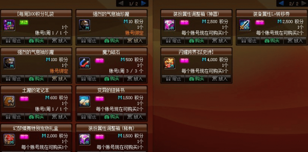 本期积分商城,一共推出了8个限定类型道具,分别是魔力磁石、土罐的笔记本、变异的扭转书、幻梦蝶舞特别宠物礼盒、装扮属性调整箱(稀有)、装扮属性调整箱(神器)、装备属性Lv转移券、闪耀跨界石【史诗】。