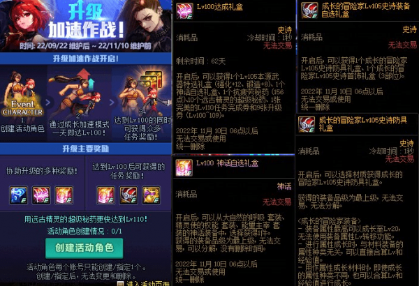 也就是预约创建小号,一天能够速成100级,同时可以获得相关奖励。本次“升级加速作战”活动,当达到满级后,就送玩家1件1件强化+12、锻造+8史诗武器,100级神话自选礼盒,但存在限制,只能选择工作服神话!