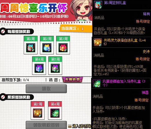 这是周签到类型活动,一共持续5周时间,每周签到的礼盒,给的道具奖励一样,可选择1件共鸣灵力装备自选礼盒,属性等级固定为35级,以及30刷图点数。