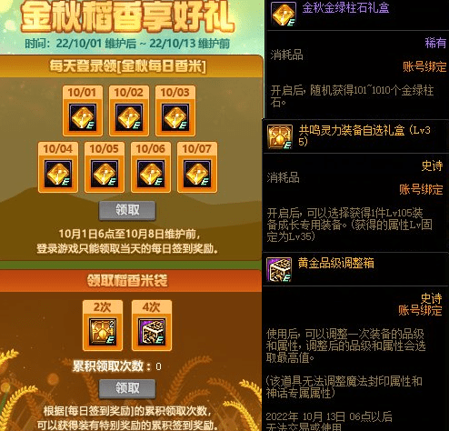 在金秋10月7天内登录时,每天会给一个金绿柱石礼盒,从这个礼盒中,随机开启获得101~1010个金绿柱石,对于绝大部分玩家来说,基本上会给保底。
