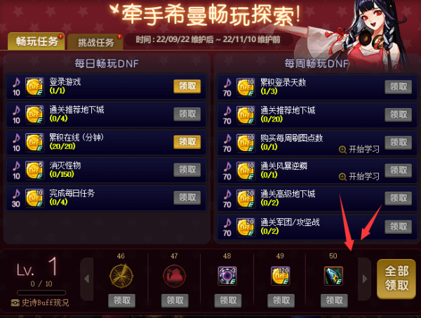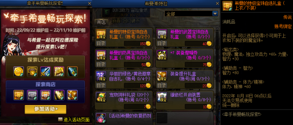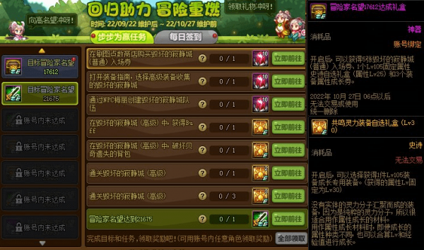 步步为赢任务,需解锁一系列任务,从而来拿专属奖励,涵盖了红色黄昏水晶、共鸣灵力装备、属性成长券等等;签到类型任务,包含黄金书、神话装备、3个固定属性装备自选礼盒;商店类型奖励,包含3个固定史诗自选、刷图点数、神器护石符文套装礼盒等等。