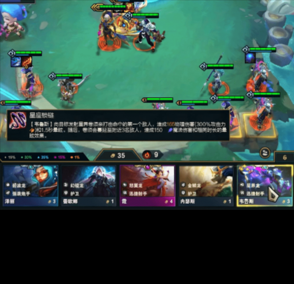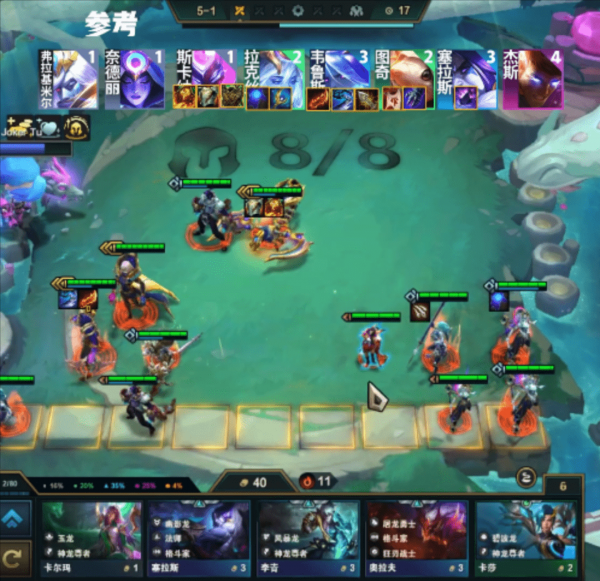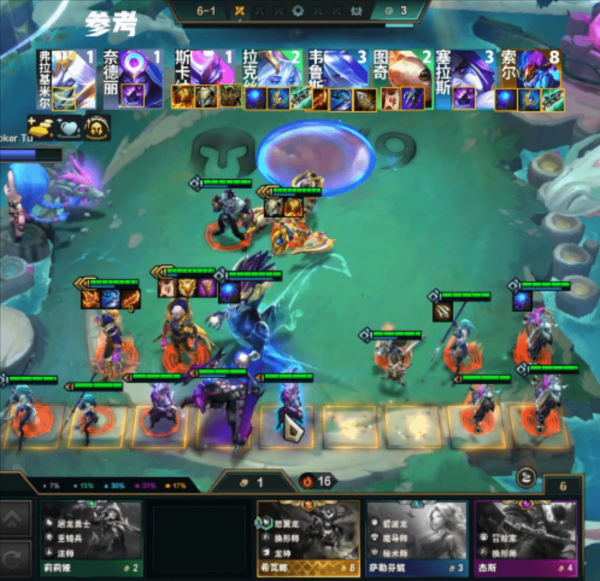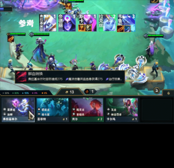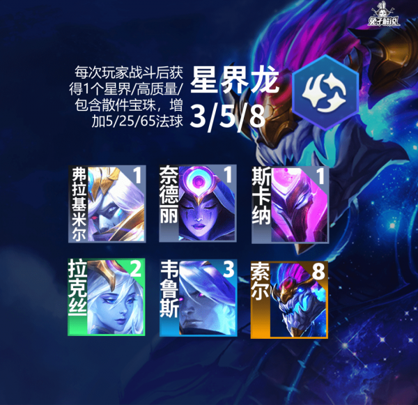 从13星开始每回合就会给8块钱以上或者给1个装备和2个散件靠着星界龙的超高的经济我们5-1就可以上到8人口只要韦鲁斯3星之后算一下总星级是不是到了13然后挂一下杰斯或者是霞都可以