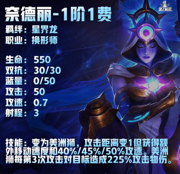 奈德丽技能:变为美洲狮,攻击距离变1但获得额外移动速度和40%/45%/50%攻速。美洲狮每第3次攻击对目标造成225%攻击物伤。