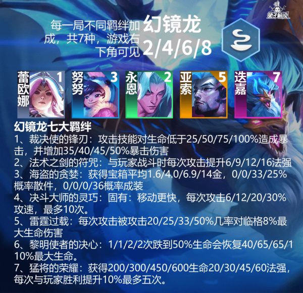 ● 裁决使:幻镜龙弈子对生命值低于一定比例(随羁绊阶数上升)的弈子造成物理和法术暴击。