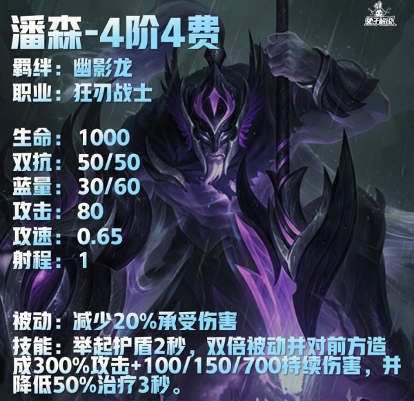 潘森被动:减少20%承受伤害技能:举起护盾2秒,双倍被动并对前方造成300%攻击+100/150/700持续伤害,并降低50%治疗3秒。