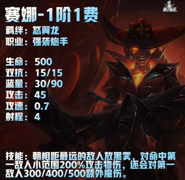 赛娜技能:朝相距最远的敌人放黑雾,对命中第一敌人小范围200%攻击物伤,还会对第一敌人300/400/500额外魔伤。