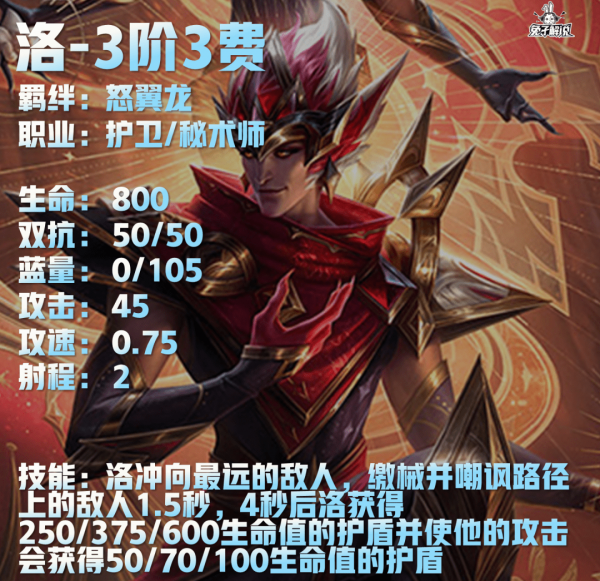 洛技能:洛冲向最远的敌人,缴械并嘲讽路径上的敌人1.5秒,4秒后洛获得250/375/600生命值的护盾并使他的攻击会获得50/70/100生命值的护盾