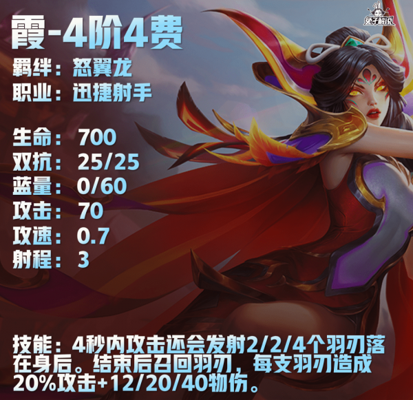 霞技能:4秒内攻击还会发射2/2/4个羽刃落在身后。结束后召回羽刃,每支羽刃造成20%攻击+12/20/40物伤。