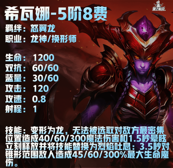 希瓦娜技能:变形为龙,无法被选取对敌方最密集位置造成40/60/300魔法伤害和1.5秒晕眩立刻释放并将技能替换为烈焰吐息:3.5秒对锥形范围敌人造成45/60/300%最大生命魔伤。