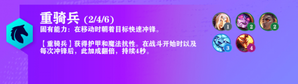 【重骑兵】获得护甲和魔法抗性,在战斗开始时以及每次冲锋后,此加成翻倍,持续4秒