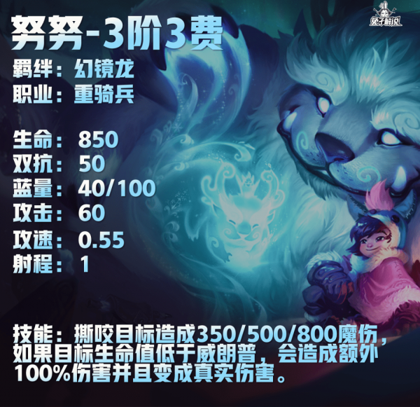 技能:撕咬目标造成350/500/800魔伤,如果目标生命值低于威朗普,会造成额外100%伤害并且变成真实伤害。
