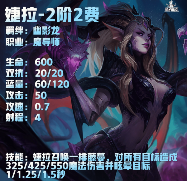 技能:婕拉召唤一排藤蔓,对所有目标造成325/425/550魔法伤害并眩晕目标1/1.25/1.5秒