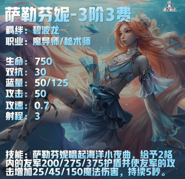 技能:萨勒芬妮唱起海洋小夜曲,给予2格内的友军200/275/375护盾并使友军的攻击增加25/45/150魔法伤害,持续5秒。