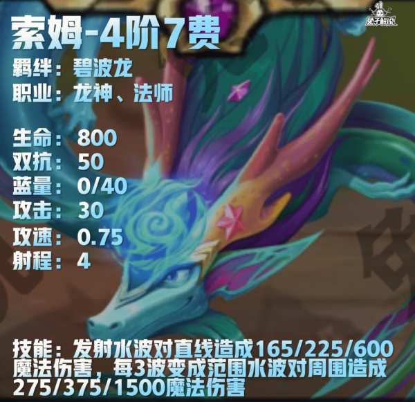 技能:发射水波对直线造成165/225/600魔法伤害,每3波变成范围水波对周围造成275/375/1500魔法伤害