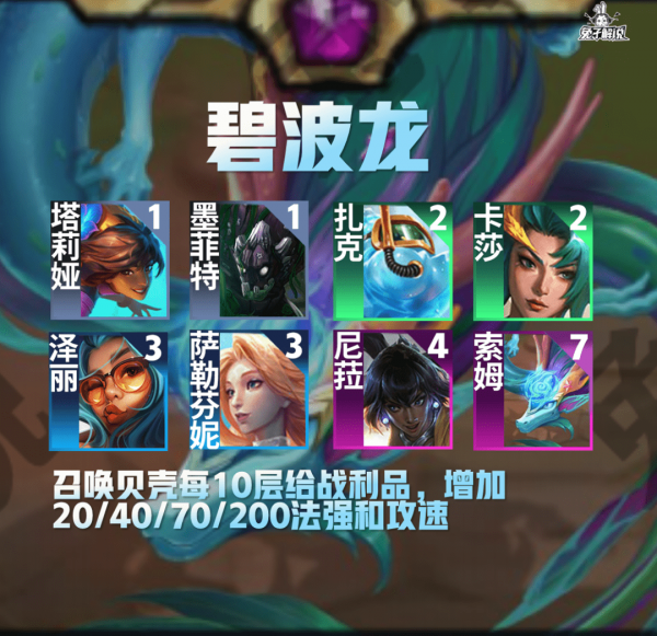【碧波龙】弈子获得额外法强和攻速。一块海石出现在棋盘上,每当一名【碧波龙】英雄释放技能时,海石就会获得充能,层数满了之后提供战利品法球