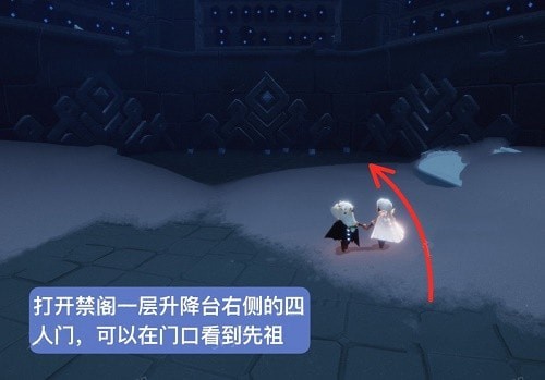 1、打开禁阁一层升降台右侧的四人门,就可以看门口看到先祖了。