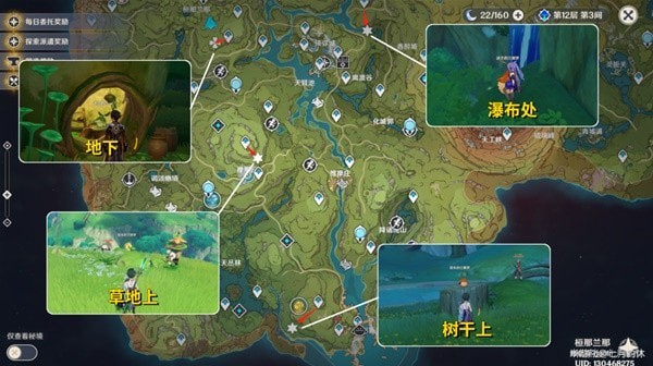 四叶草的在地下,从传送点过来往草元素方碑左边的路一直往里走,在雷史莱姆处的位置头上树枝上。然后一直出来,在瀑布处5颗。