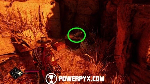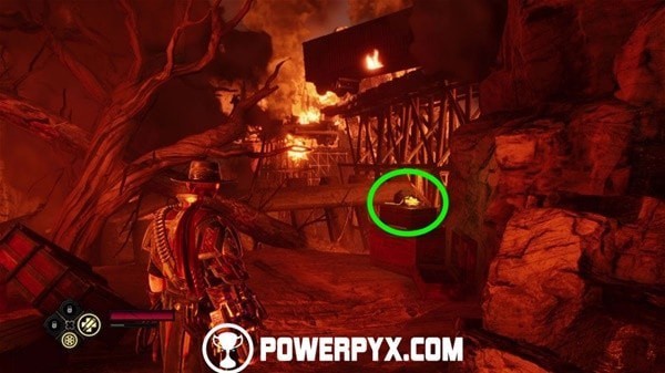 继续前进,爬梯子上来后,前边有个发光的箱子,用左轮手枪打爆它就能拿到钱。
