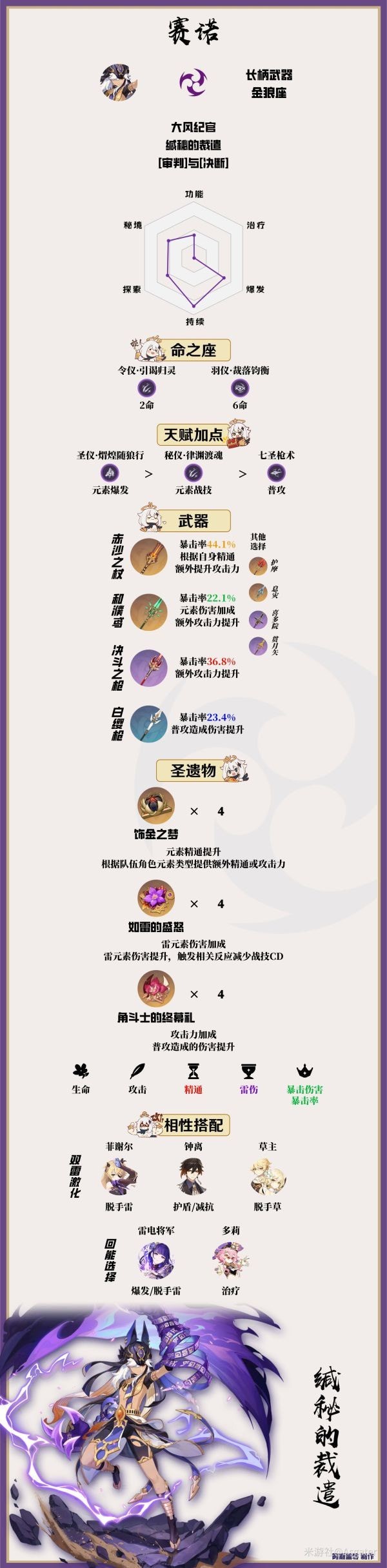 赛诺自身的基础倍率区间包涵了赛诺的攻击力、固有天赋的精通转化机制、超激化的基础伤害提升,武器优先考虑双暴可以补正赛诺其他区间,非五星优先考虑精5等级。