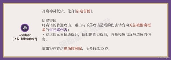 【注】赛诺开启元素爆发后的普攻为单独的普攻模组,该普攻的等级不影响赛诺施放元素爆发后的普攻伤害,可以选择不升级。