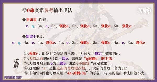②.1命的攻速提高可以让“4a-冲刺-3a(非如雷)”、“4a-2级e-3a(如雷)”的手法变为“4a-X-4a”的循环(X为如雷的接e,或非如雷的冲刺取消后摇),小幅度地提高了赛诺的输出能力