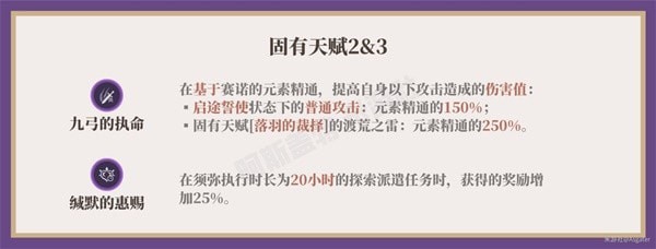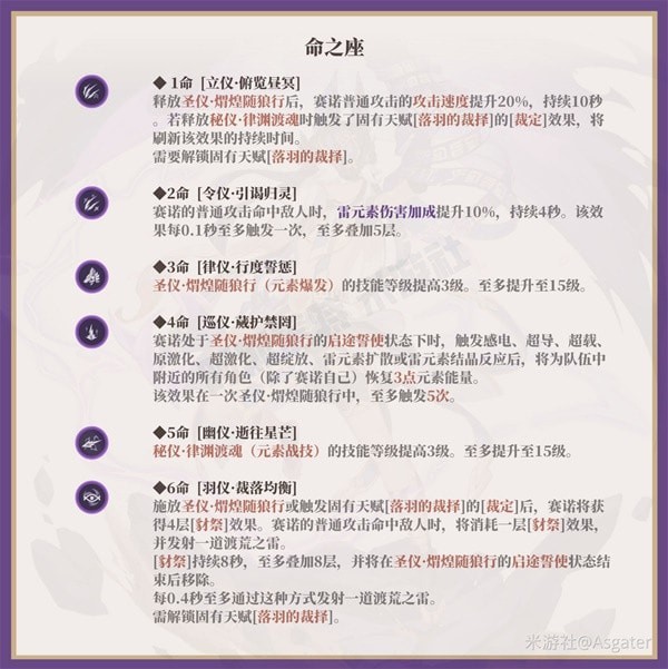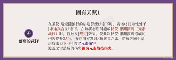 天赋1(落羽的裁择)的3道渡荒之雷命中同一敌人时仅产生1次弱雷元素附着(9.5秒)