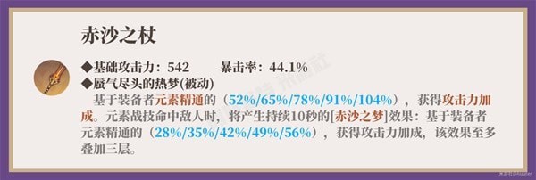 赛诺的毕业武器,叠加精通既配合赛诺的固有天赋,也转而通过赤沙之杖提高了赛诺的攻击力。另外,元素精通越高,该武器的效果提高越明显,如果未来的版本中可以有某位角色提高队友的精通,那么会进一步拉大赤沙之杖与其他武器的差距。