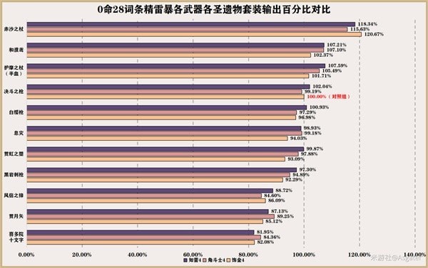 ①.由上图的各武器各圣遗物对比图可知,在0命条件下,这3套圣遗物的差距对于各种武器而言差距较小(基本保持在5%以内),也就是说如果已经有了词条很优秀的角斗士、如雷4件且不打算抽取赛诺的高命座、高精炼武器,那么可直接选择