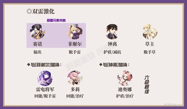 赛诺与菲谢尔组成双雷元素共鸣,触发雷元素相关反应时会产出额外雷元素微粒,优化赛诺大招的能量积累。