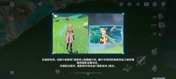 在留影阶段,当旅行者使用「留影机」拍摄画片时,画片完成时的角度将由之前所调整的留影设置决定。在留影过程中,留影的方向会由「留影射光」指示。