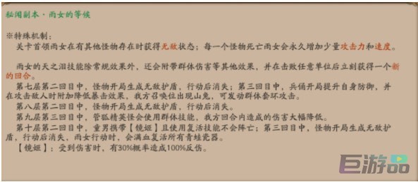 从第十层第二回合开始,每当小吸血姬被击杀时,中间的大吸血姬都会释放一个群体的吸血大招。雨女在所有青蛙死光之前是无敌的,也就说你必须先杀死5只青蛙,否则雨女不会掉血。青蛙死后会释放一次无消耗的岭上开花,中间青蛙的岭上开花是群体的,单只伤害虽然不高但5只叠加起来还是挺恶心的,另外没只青蛙死亡后都会增加雨女的速度。每当雨女行动时,会让复活所有已死的青蛙。