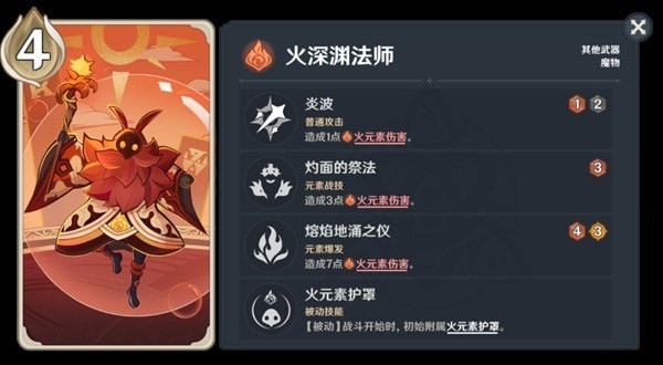 火深渊法师的标准生命值为 4 点, 只能造成火元素伤害, 元素爆发充能需求为 3 点, 爆发伤害为 7 点。
