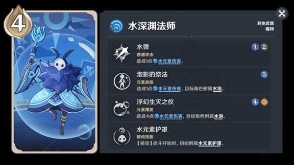 水深渊法师的标准生命值为 4 点, 只能造成水元素伤害, 元素爆发充能需求为 3 点, 爆发伤害为 4 点。