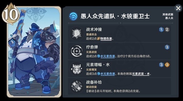 水铳重卫士的标准生命值为 10 点, 能造成物理伤害、水元素伤害, 元素爆发充能需求为 3 点, 爆发伤害为 3 点。