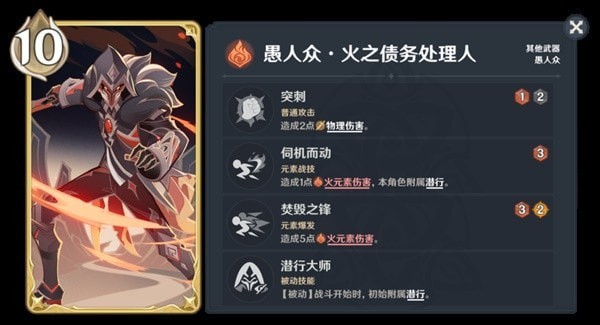 火之债务处理人的标准生命值为 10 点, 能造成物理伤害、火元素伤害, 元素爆发充能需求为 2 点, 爆发伤害为 5 点。