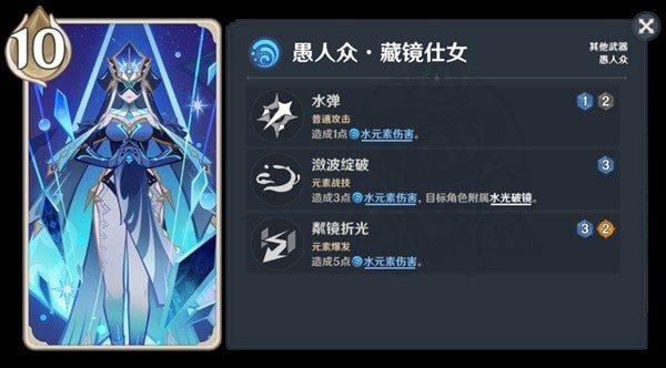 藏镜仕女的标准生命值为 10 点, 只能造成水元素伤害, 元素爆发充能需求为 2 点, 爆发伤害为 5 点。
