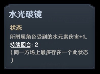 藏镜仕女的元素战技“潋波绽破”将为目标角色附属角色状态水光破镜, 使得其附属角色受到的水元素伤害值 +1, 初始持续回合为 2, 上限为 2。