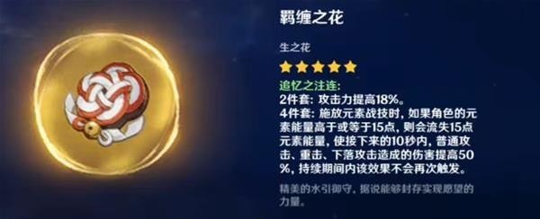 二件套增加18%攻击力,四件套消耗大招能量,增加50%普通攻击伤害,宵宫主要靠的就是普通攻击来打伤害,所以首先推荐就是追忆四件套,唯一的缺点就是要舍弃宵宫唯一的群伤技能元素爆发,但同时也有一个优点,那就是不需要升级元素爆发,可以省下大量材料