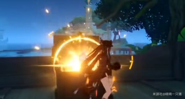 3、来到奥摩斯港上方的桥,从水风车上飞下去,就能看到一个珍贵宝箱