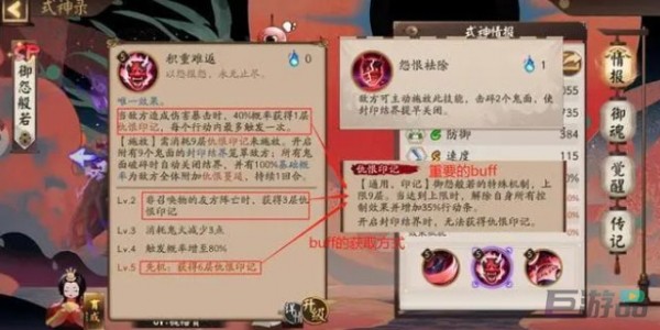 在御怨般若的技能中,有一个比较重要的buff"仇恨印记",这个buff也开启"封印结界"的关键,当"仇恨印记"叠加9层之后,就会开启结界。先来说一下结界开启之后的效果,后续总结印记的获取方式,结界是有9个鬼面围绕着的,是给全体敌方的一个结界,处于结界中所有敌方的被动技能都被替换成了"怨恨祛除"技能,敌方可以消耗1点鬼火击碎2个鬼面,当9个鬼面全部击碎,结界会自动关闭。